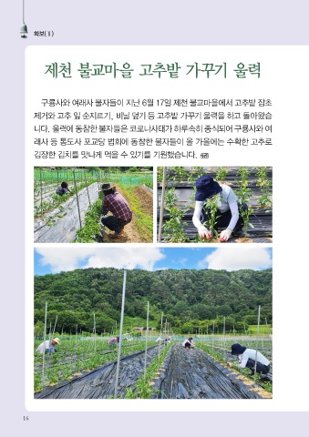 화보(Ⅱ) 제천 불교마을 고추밭 가꾸기 울력 구룡사와 여래사 불자들이 지난 6월 17일 제천 불교마을에서 고추밭 잡초 제거와 고추 잎 순지르기, 비닐 덮기 등 고추밭 가꾸기 울력을 하고 돌아왔습 니다. 울력에 동참한 불자들은 코로나사태가 하루속히 종식되어 구룡사와 여 래사 등 통도사 포교당 법회에 동참한 불자들이 올 가을에는 수확한 고추로 김장한 김치를 맛나게 먹을 수 있기를 기원했습니다. 16 17