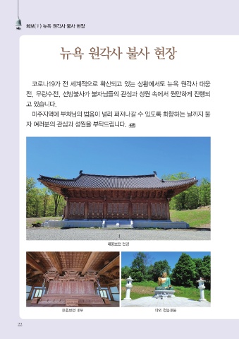 화보(Ⅴ) 뉴욕 원각사 불사 현장 뉴욕 원각사 불사 현장 코로나19가 전 세계적으로 확산되고 있는 상황에서도 뉴욕 원각사 대웅 전, 무량수전, 선방불사가 불자님들의 관심과 성원 속에서 원만하게 진행되 고 있습니다. 미주지역에 부처님의 법음이 널리 퍼져나갈 수 있도록 회향하는 날까지 불 자 여러분의 관심과 성원을 부탁드립니다. 대웅보전 전경 대웅보전 내부 야외 청동대불 22 23