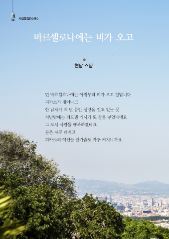 시심불심詩心佛心 바르셀로나에는 비가 오고 ● 현담 스님 먼 바르셀로나에는 아침부터 비가 오고 있답니다 피카소가 태어나고 한 남자가 백 년 동안 성당을 짓고 있는 곳 지난밤에는 리오넬 메시가 또 골을 넣었다네요 그 도시 사람들 행복하겠네요 골은 자꾸 터지고 피카소의 여인들 앞가슴도 자꾸 커지니까요 36