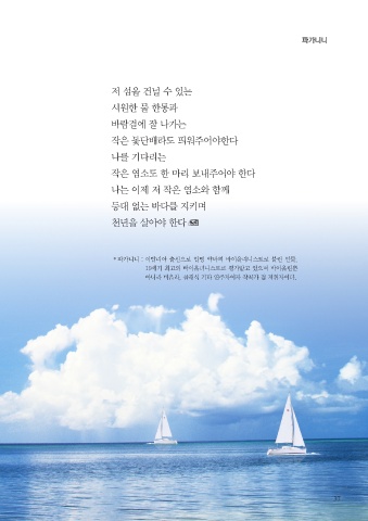 파가니니 저 섬을 건널 수 있는 시원한 물 한통과 바람결에 잘 나가는 작은 돛단배라도 띄워주어야한다 나를 기다리는 작은 염소도 한 마리 보내주어야 한다 나는 이제 저 작은 염소와 함께 등대 없는 바다를 지키며 천년을 살아야 한다 *파가니니 : 이탈리아 출신으로 일명 악마의 바이올리니스트로 불린 인물. 19세기 최고의 바이올리니스트로 평가받고 있으며 바이올린뿐 아니라 비올라, 클래식 기타 연주자이자 작곡가 겸 지휘자이다. 37
